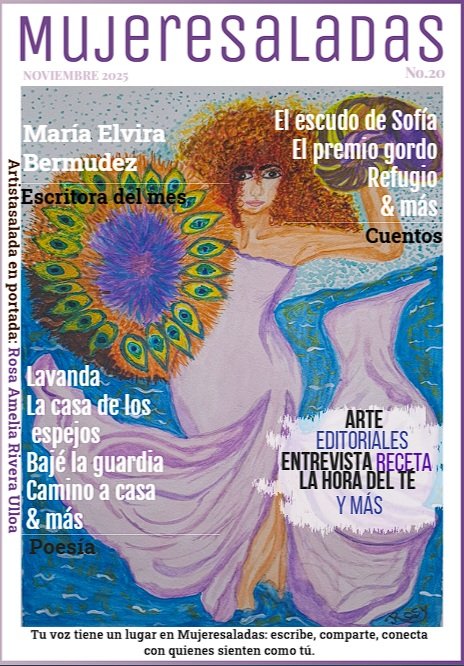 Querida comunidad: hoy es un día especial, publicamos la edición Nº20 de nuestra preciosa revista y no puedo dejar de emocionarme ¡VEINTE! y aquí, seguimos, veinte números después aun creyendo en lo mismo: que compartir palabra es también darnos un refugio. Gracias a todas las MUJERESALADAS que escriben, ilustran, corrigen, leen y sueñan con nosotras cada mes —esto no sería nada sin ustedes—; en este número encontrarás cuentos, poesía, crónicas, recetas y el arte acuoso y luminoso de Rosa Amelia Rivera. Recuerda que salimos el 8 de cada mes, y si tienes un ratito léela con calma que está hecha con mucho cariño. Y si algo en estas páginas te toca, compártelo: comparte la revista, invita a una amiga a escribir, pega el enlace en tu muro. Que esto no se quede entre nosotras sino que nos haga más, más fuertes, más visibles. Que la comunidad crezca y nos haga poderosas: juntas tenemos más voz, más mundo y más posibilidad de cambiarlo.